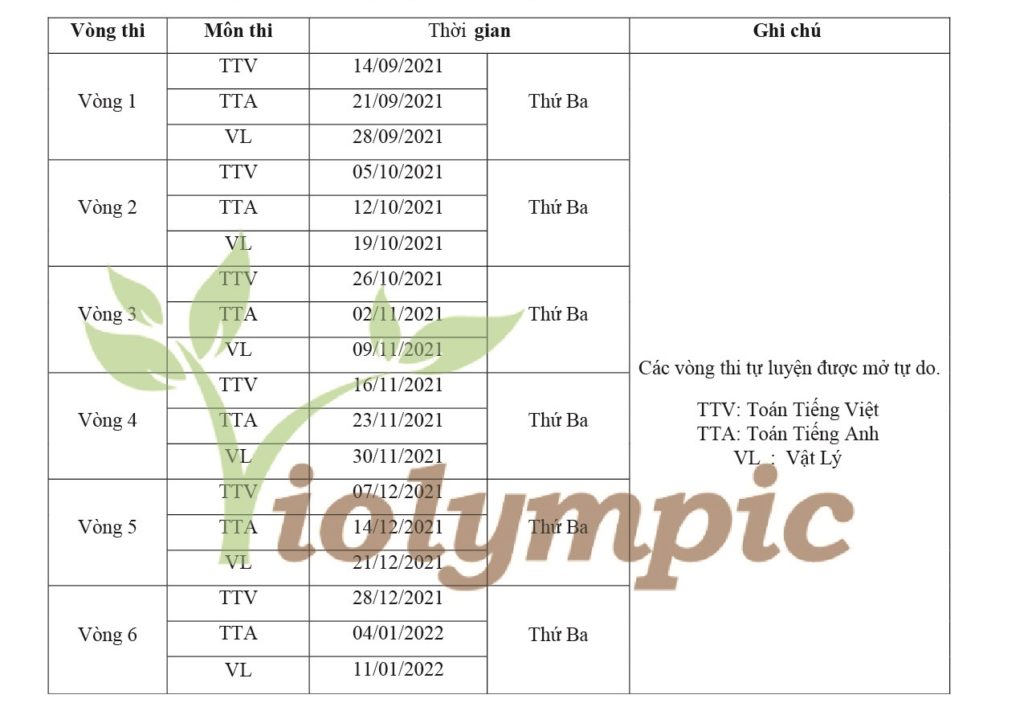 Lịch thi các vòng tự luyện Violympic dự kiến cho năm học 2021 – 2022: