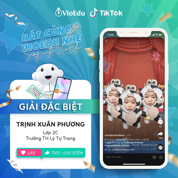 Giải đặc biệt này đã thuộc về bạn Trịnh Xuân Phương, học sinh lớp 2C trường Tiểu học Lý Tự Trọng với 146 tim, 7583 lượt chia sẻ và được BTC thưởng 100 điểm.
