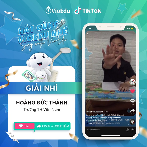 Giải thưởng bao gồm: 1 Giấy chứng nhận online từ BTC VioEdu, 1 Gấu bông linh vật VioEdu – Robot, 1 Mã gia hạn 50% khóa học cho năm tiếp theo, 1 Đèn led tích hợp loa bluetooth.