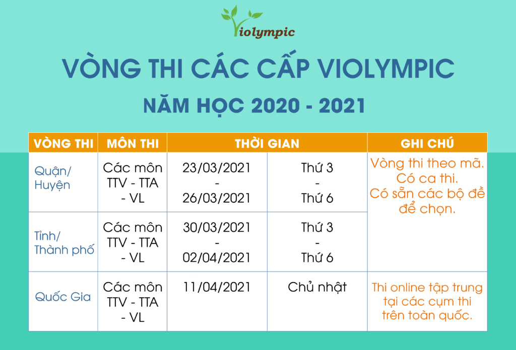 Vòng thi Cấp Quận/Huyện Violympic các môn thi Toán, Vật lí năm học 2020-2021 sẽ chính thức diễn ra từ 08h00 đến 18h00 các ngày 23/03/2021 đến ngày 26/03/2021 (thứ ba đến thứ sáu).